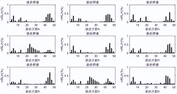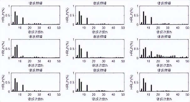 由表3可以看出,刘府牵引变电所B相、水家湖牵引变电所B相、邵岗牵引变电所A相谐波电压总畸变率95%概率值是各相中*大的,谐波畸变率实测曲线如图9、图10、图11所示,谐波电压总畸变率95%概率大值附近9个点对应的频谱如图12、图13、图14所示。