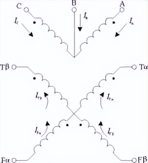 牵引变电所采用V/X牵引变压器,其原理如图5所示,高压侧接入电力系统220kV三相电源,二次侧设2台单相变压器,分别为变电所α和β两侧供电臂供电,其中每个单相变压器设有T和F绕组,二次侧Tα、Tβ之间,Fα、Fβ之间电压相位相差60°。