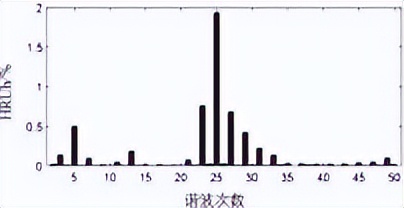 水家湖牵引变电所C相电压总谐波畸变率实测曲线如图15所示,可以看出水家湖牵引变电所发生了密集的谐振,尤其在16时左右和21时左右发生了严重的谐振,谐波含量超过了2%;其频谱如图16所示,25次谐波发生谐振。